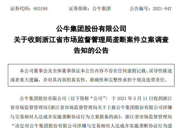 此次公牛集团因为“涉嫌与交易相对人达成并实施垄断协议行为”,遭浙江市场监管局立案调查。