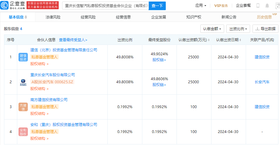 企查查APP显示,5月12日,重庆长信智汽私募股权投资基金合伙企业(有限合伙)成立,执行事务合伙人为安和(重庆)股权投资基金管理有限公司,注册资本5.02亿元人民币,经营范围包含:以私募基金从事股权投资、投资管理、资产管理等活动。企查查股权穿透显示,长安汽车(000625)对该公司持股49.8008%。