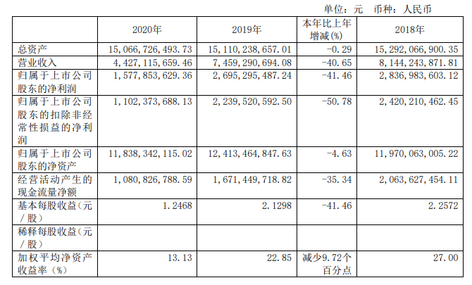 根据业绩报告显示,2020年养元饮品实现营业收入44.27亿元,同比下滑40.65%;归属于上市公司股东的净利润为15.78亿元,同比下滑41.46%;归属于上市公司股东的扣除非经常性损益的净利润为11.02亿元,同比下滑50.78%。