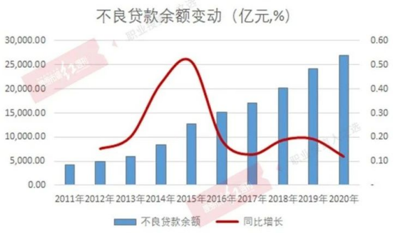 据银保监会数据显示,从2011年至2020年,中国商业银行不良贷款余额以22.72%的复合增长率增长,至2020年末,不良贷款余额2.7万亿元。
