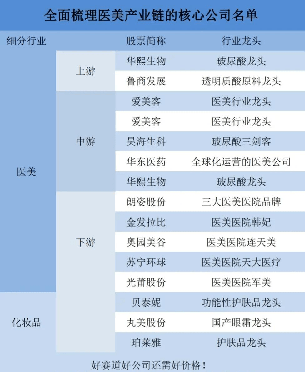 2、医美产业链中游主要有华熙生物、昊海生科、爱美客、华东医药等公司。
