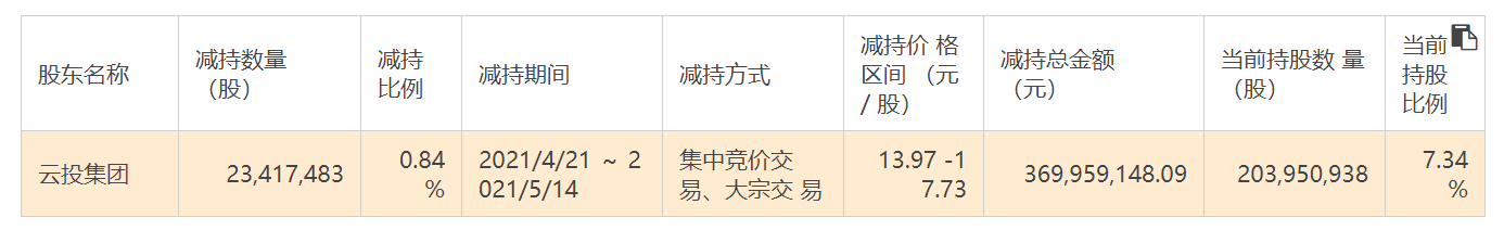 云投集团自2021年4月21日至2021年5月14日,通过集中竞价方式减持公司股份2143.75万股,占公司总股本的0.77%,减持价格区间为14.85-17.73元/股,减持金额3.42亿元;通过大宗交易方式减持公司股份198万股,占公司总股本的0.07%;合计减持公司股份2341.75万股,占公司总股本的0.84%,减持价格区间为13.97-14.18元/股,减持金额2786.40万元。