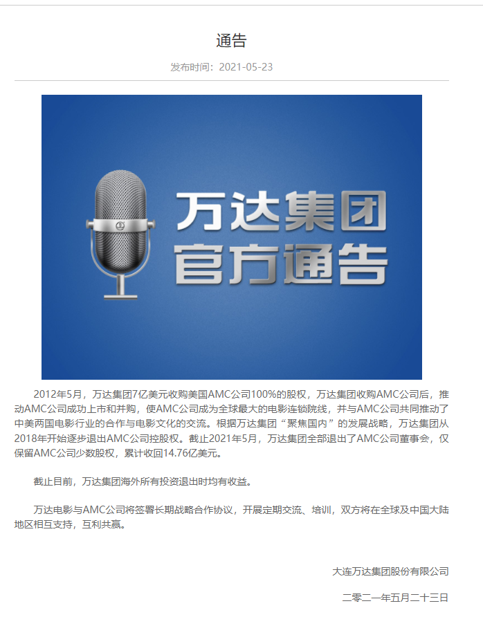 通告显示,2012年5月,万达集团7亿美元收购美国AMC公司100%的股权,万达集团收购AMC公司后,推动AMC公司成功上市和并购,使AMC公司成为全球最大的电影连锁院线,并与AMC公司共同推动了中美两国电影行业的合作与电影文化的交流。根据万达集团“聚焦国内”的发展战略,万达集团从2018年开始逐步退出AMC公司控股权。截止2021年5月,万达集团全部退出了AMC公司董事会,仅保留AMC公司少数股权,累计收回14.76亿美元。