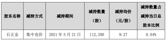 公告显示,减持前石正金合计持有公司股份448,990股,本次减持后持有股份336,790股,占总股本比例0.13%。