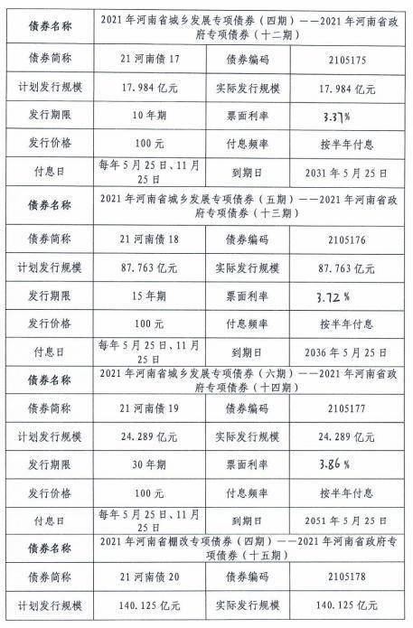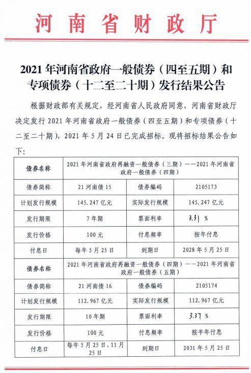 【大河财立方消息】5月24日,河南省财政厅公告,2021年河南省政府一般债券(四至五期)和专项债券(十二至二十期)已完成招标。