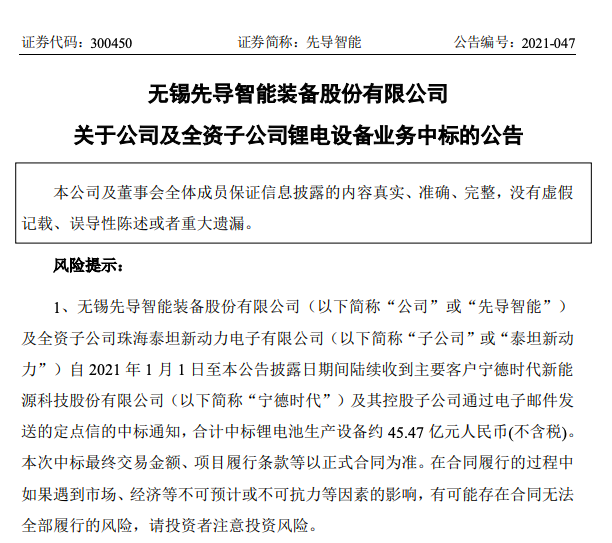 中华网财经5月31日讯,无锡先导智能装备股份有限公司(以下简称“先导智能”)发布公告称,先导智能及全资子公司泰坦新动力自2021年1月1日至公告披露日期间陆续收到主要客户宁德时代新能源科技股份有限公司(以下简称“宁德时代”)及其控股子公司通过电子邮件发送的定点信的中标通知,合计中标锂电池生产设备约45.47亿元人民币。