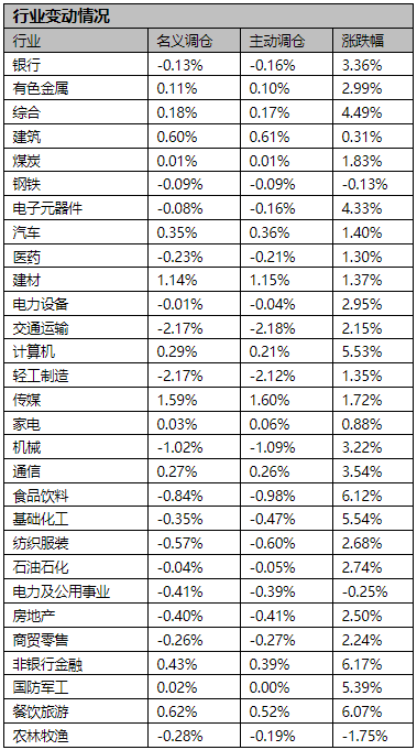 行业配置方面,传媒、建材和建筑三个板块被公募基金主动相对大幅加仓,幅度分别为1.59%、1.14%和0.62%;而交通运输、轻工制造和机械逐渐主动减持,与名义调仓基本一致,减仓幅度分别为2.17%、2.17%和1.02%。