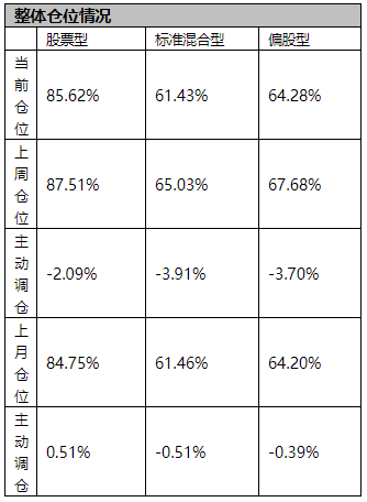 其中,股票型基金仓位下降1.89%,标准混合型基金仓位下降3.60%,当前仓位分别为85.62%和61.43%。
