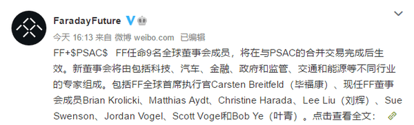 “我们很荣幸这些多元化的行业领军人物能够在FF上市这个关键时间节点加入我们,”FF全球首席执行官毕福康说,“我们的新董事会成员将为FF提供宝贵的经验和领导力,并帮助指导FF 91 发布的运营准备和建设工作。”