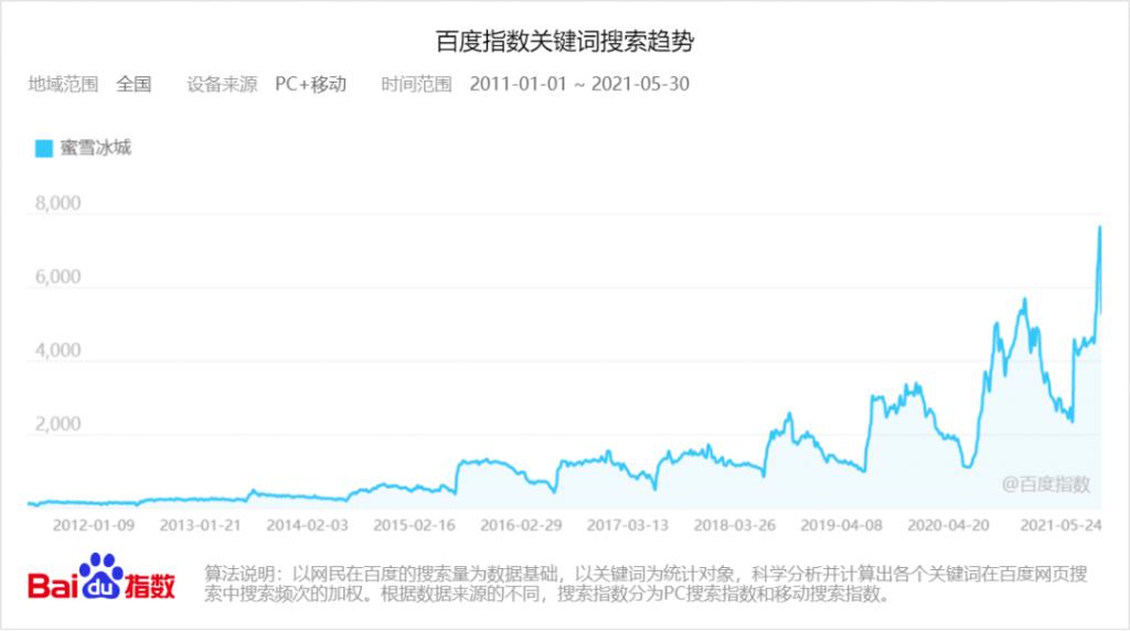 相比以往的闷声发大财,2020年达到万家门店以后,根据百度指数显示,蜜雪冰城的网络曝光度明显高了很多。