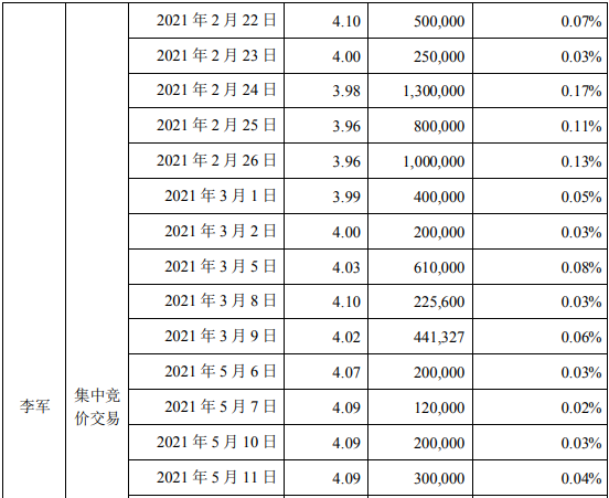 公告显示,减持前李军合计持有公司股份42,866,928股,本次减持后持有股份32,150,218股,占总股本比例4.24%。