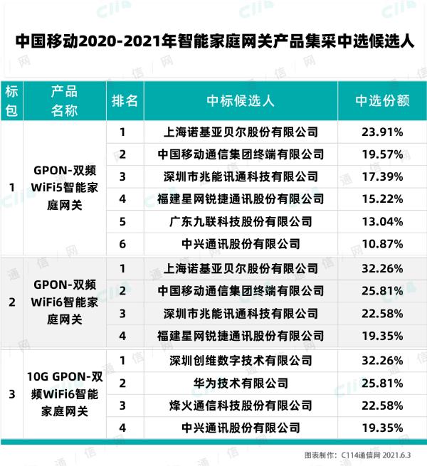 其中,采购包一GPON-双频WiFi5智能家庭网关和采购包二GPON-双频WiFi6智能家庭网关的中选候选人已于今年2月和3月分别发布。至此,中国移动2020-2021年智能家庭网关产品集采项目中选候选人全部落定。