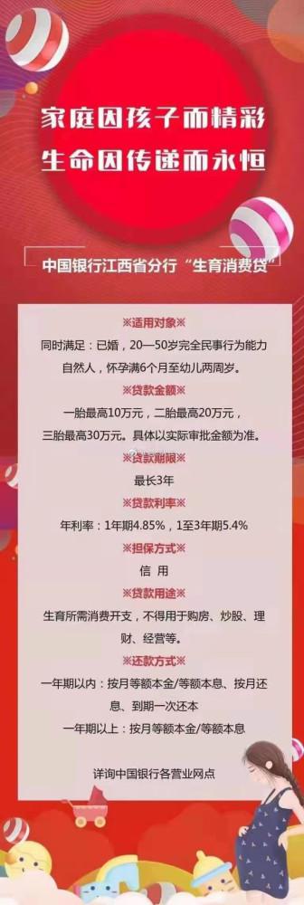 近日消金界发现,中国银行(601988.SH)江西分行推出面向三胎家庭的"生育消费贷"——面向三胎家庭,推出最高30万元额度、1年期年化利率4.85%的贷款产品。