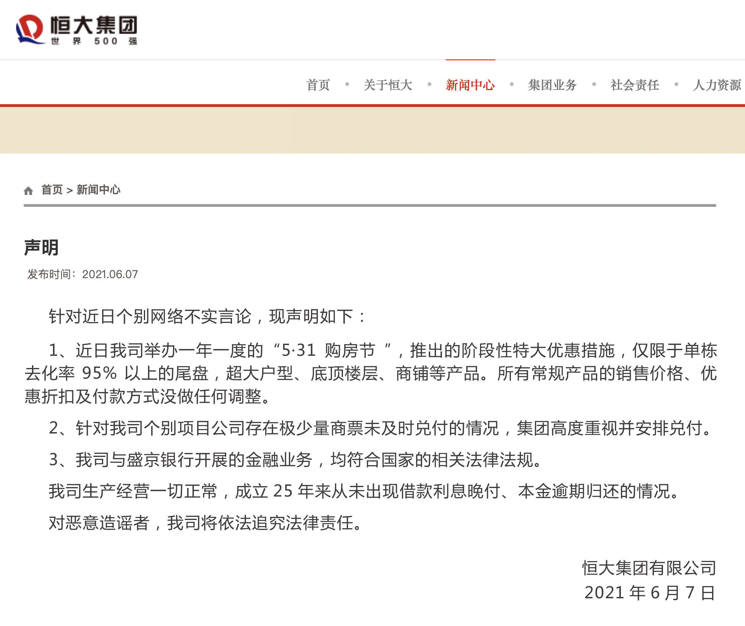 6月7日,恒大集团发布声明,围绕打折卖房、恒大经营状况、资金链等发酵出各种谣言,进行正面回应。