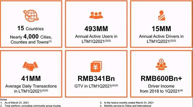 截至2021年3月31日的3个月里,滴滴平台上有1.56亿月平均活跃用户,同时平均每日订单量高达2500万笔。