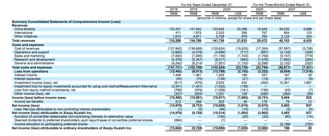 滴滴出行在2018年、2019年和2020年的营收分别为1353亿元、1548亿元和1417亿元(约合216亿美元),截至2021年3月31日的三个月的营收为422亿元(约合64亿美元)。