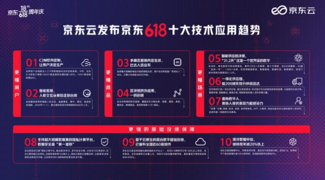 具体来看京东云618十大技术应用趋势,分别为C2M反向定制,让用户决定生产;智能客服,人机交互从幕后走到台前;多模态营销内容生成,比达人还会写;区块链防伪追溯,一码到底;智能供应链决策,“31.2天”这是一个世界级的数字;一体化供应链,超200城实现分钟级送达;虚拟数字人,高拟人度的表现力和感染力;支持超大规模数据集的隐私计算平台,数据安全是“第一准则”;基于云原生的混合数字基础设施,已遍布全国近60座城市;液冷数据中心,碳排放年减20%以上。