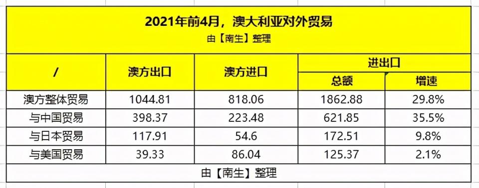 在澳元兑美元升值,铁矿石、铜矿石以及粮食等大宗商品价格大涨的背景下,2021年前4个月,澳大利亚对外贸易额上涨至1862.88亿美元,同比大增29.8%(本文提到的增速,均为美元角度换算的)。