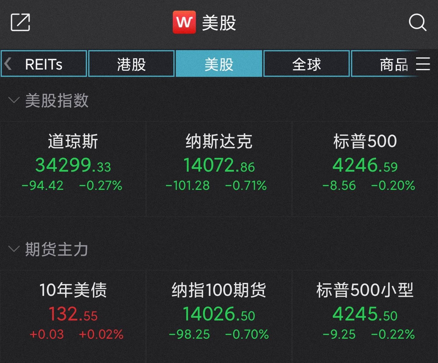 具体来看,截至收盘,道指跌94.42点,跌幅0.27%,报34299.33点;纳指跌101.28点,跌幅0.71%,报14072.86点;标普500指数跌8.56点,跌幅0.20%,报4246.59点。