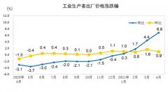 中新网5月11日电 据国家统计局网站消息,2021年4月份,全国工业生产者出厂价格同比上涨6.8%,环比上涨0.9%;工业生产者购进价格同比上涨9.0%,环比上涨1.3%。14月平均,工业生产者出厂