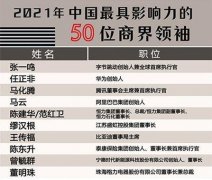 2021年中国最具影响力的50位商界领袖:字节跳动CEO张一鸣荣登榜首 财富中文网本周公布了《2021年中国最具影响力的50位商界领袖》,字节跳动创始人兼全球首席执行官张一鸣(38岁)荣登