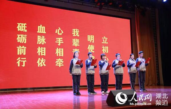 人民网武汉12月10日电 “立初心、明使命,志存高远、脚踏实地、勤于奋斗、甘于奉献,青春无悔,报效祖国!”整齐洪亮的青春誓言回响在武汉第三寄宿中学的报告厅里。12月9日下午,“立初心、明使命”系列教育实践活动第三场“同宣一次誓言”汉阳区新团员入团仪式在武汉第三寄宿中学报告厅举行,青年教师、新老团员、入团积极分子代表等近千人参与此次活动,现场共享体验“沉浸式”思想教育。据悉,一二·九期间,武汉市汉阳区将有800余名优秀中学生光荣加入中国共青团,当天全区多所中学同步举行了新团员入团仪式。