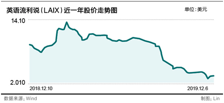 截至今年12月6日美股收盘,流利说股价为2.61美元/股,公司市值为1.28亿美元,相比2018年9月27日(美东时间)上市首日总市值6.07亿美元下跌近八成,自2018年12月10日至2019年12月6日公司股价已暴跌70%。