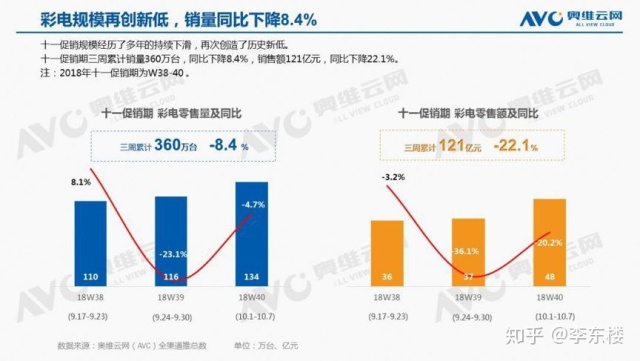 近日,中国彩电市场2019年前三季前三季度数据出炉。据西柚了解,前三季度彩电出货量为3460万台,同比下滑2.8%,其中三季度出货量为1220万台,同比大幅减少7.4%,下滑幅度进一步在加大。彩电销售规模正逐渐减少,而彩电均价也降至新低。在上个月的双十一,电视产品零售均价为2095元,同比下降15%。