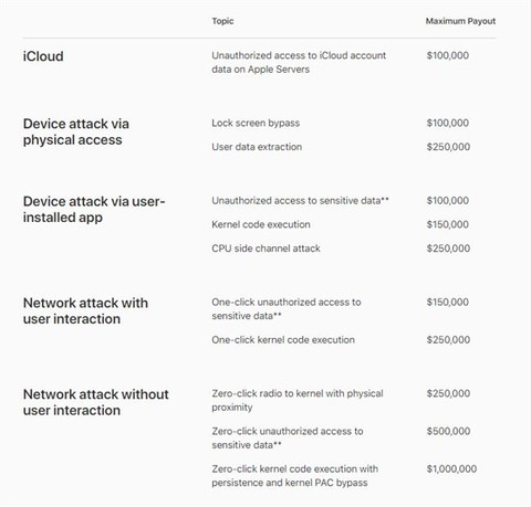 苹果公司今天还在其网站上发布了一个新的页面,详细介绍了bug bounty计划的规则,并对研究人员提交的每一个漏洞所能获得的奖励进行了细分。