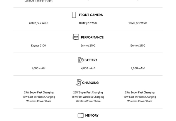 更重要的是,据国外知名爆料人@evleaks的最新消息,三星此次还将为Galaxy S21全系标配25W“快充”,与iPhone 12系列的20W快充相差无几。
