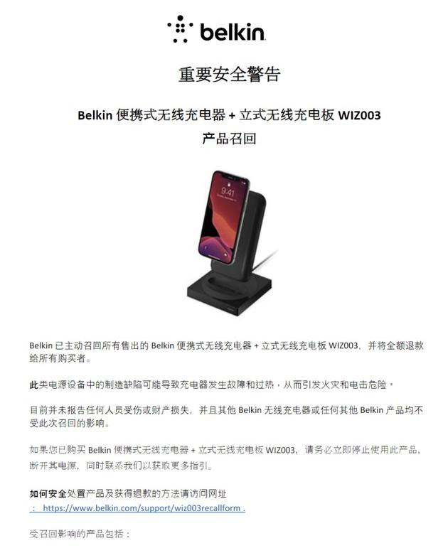 配件厂商贝尔金近日发布重要安全警告,宣布召回型号为 WIZ003 的便携式无线充电器 + 立式无线充电板。官方表示这款产品因制造缺陷可能会发生故障和过热,从而引发火灾和电击危险。