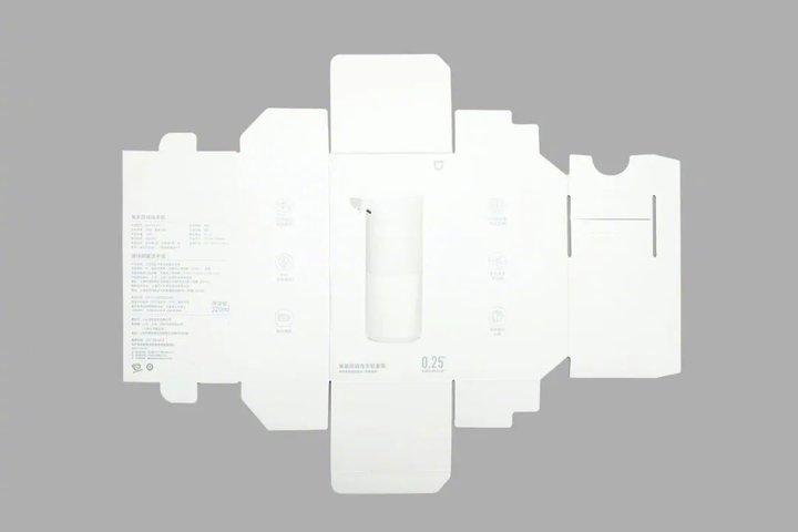 ▲米家自动洗手机套装‘一纸盒’实物 折叠前后对比。 图片来自:小米