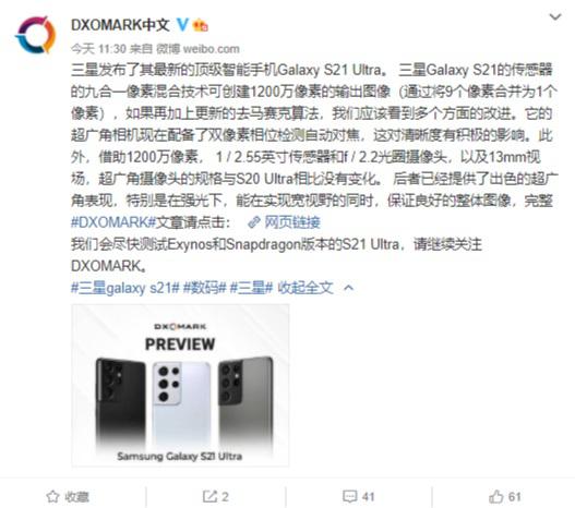 DXOMark 今日表示将尽快为 Galaxy S21 Ultra 进行评测,参考此前惯例,三星预计未将 Galaxy S21 Ultra 送测,因此 DXO 测试结果仍需要一段时间才能出炉。