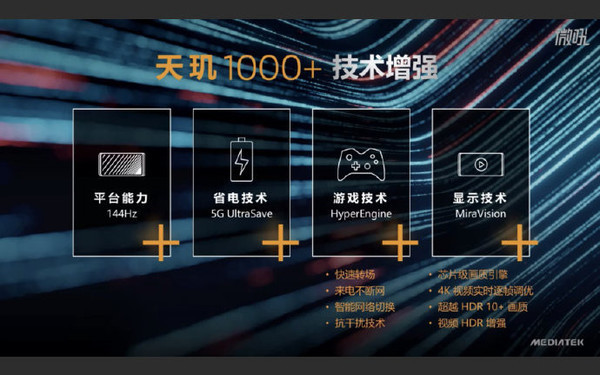 天玑1000+芯片是天玑1000的升级版,升级主要围绕当下的热点展开,包括支持144Hz屏幕,优化了5G网络下的能耗,强化了游戏技术和显示技术等。另外,该芯片还支持144Hz刷新率屏幕,采用了5G UltraSave省电技术,还有HyperEngine游戏技术和MiraVision显示技术加持,可以快速转场、智能切换网络等,带来超越HDR 10+的画质等,芯片级的画质引擎加上APU 3.0,支持实时4K视频动态画质调优,依据AI场景识别,能够调整每帧画面的对比度、锐利度和色彩。看到这,你是不是开始对这款芯片的表现开始好奇了?