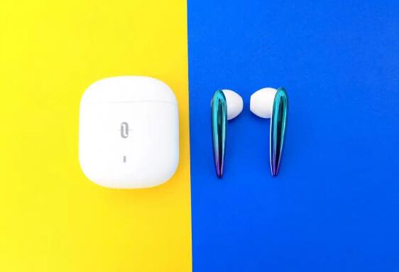 再来看看耳机的外观,耳机采用渐变真空电镀工艺,紫色、蓝色渐变,非常炫酷,由此可以看出这款耳机走的青春潮流路线,适合时尚人群使用;同时,出众的外观让TT-BH080拥有很好的辨识度,避免了误认为"山寨版"AirPods的尴尬。