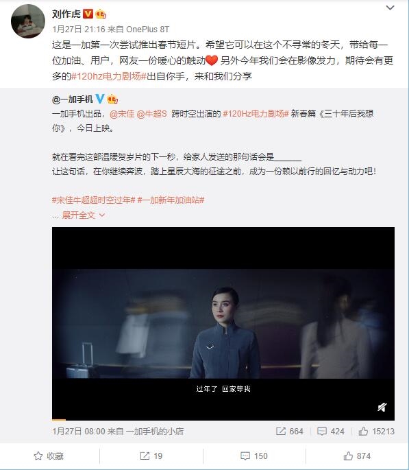 1月27日晚,一加创始人兼首席执行官刘作虎表示,这是一加第一次尝试推出春节短片,希望它可以在这个不寻常的冬天,带给每一位加油、用户、网友一份暖心的触动。另外今年我们会在影像发力,敬请期待。