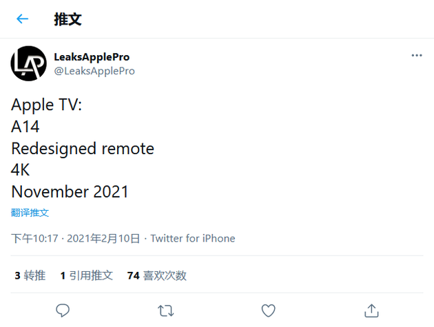 在推文中,LeaksApplePro 还提及了苹果将会对遥控器进行重新设计。根据此前的谣传,Apple TV 6 将会搭载游戏手柄。目前尚不清楚苹果是否会捆绑销售还是对单独出售。我们也不知道预期的价格,只知道2021年的Apple TV会有两种存储配置。