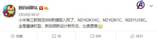 IT之家2月21日消息 小米以及 Redmi 方面目前有着多款新机待发,包括搭载骁龙 870、骁龙 888、天玑 1200 等多款高端 SoC 的产品。数码博主 @数码闲聊站 昨日爆料称,小米现有三款新旗舰机型入网,型号分别为 M2102K1AC、M2102K1C、M2011J18C。