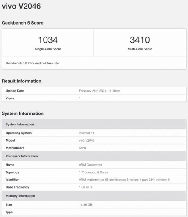 代号为 V2046 的手机为 X60 Pro 海外版。这款手机同样搭载高通骁龙 870 处理器,但是主摄升级为 f/1.48 超大光圈镜头,具有 5 倍光学变焦潜望镜头,可实现 60 倍数码变焦。手机跑分使用了 Geekbench 5.3.2,多核成绩 3410 分,符合骁龙 870 的实际性能表现。