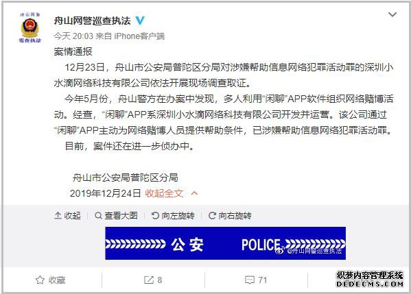 详细信息如下:12月25日上午消息,浙江省舟山市公安局普陀区分局昨日发布案情通报,称今年5月份,舟山警方在办案中发现,多人利用“闲聊”App软件组织网络赌博活动。