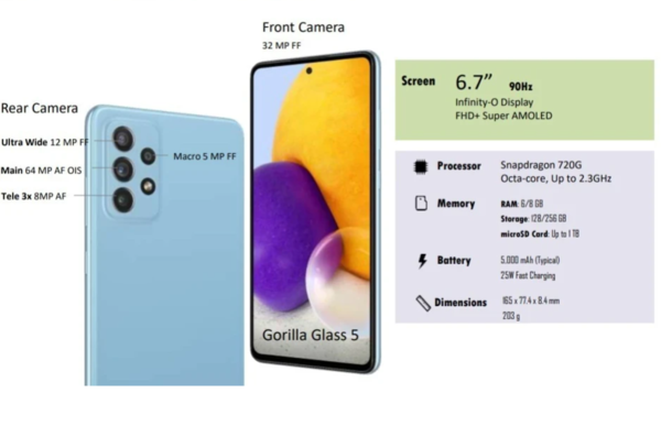 详细配置方面,三星Galaxy A52 5G配备了一块6.5英寸FHD+ 120Hz屏幕,搭载了前置32MP,后置64MP主摄+12MP超广角+5MP+5MP四摄组合;拥有骁龙750处理器,支持IP67防尘防水、支持屏下指纹,内置了一块4500mAh电池,随机附送15W充电头。