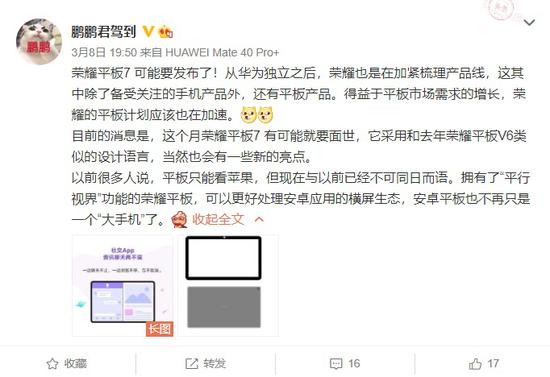 据微博博主 @鹏鹏君驾到 消息,荣耀在加紧梳理产品线,这其中除了备受关注的手机产品外,还有平板产品。得益于平板市场需求的增长,荣耀平板计划应该也在加速。