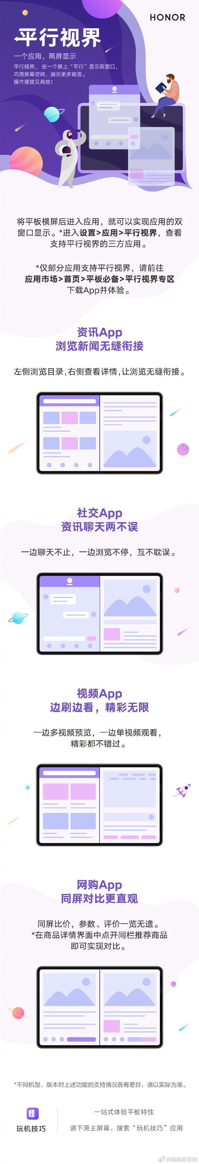 IT之家获悉,荣耀平板 7 采用和去年荣耀平板 V6 类似设计语言,当然也会有一些新的亮点。拥有 “平行视界”功能的荣耀平板,可以更好处理安卓应用的横屏生态,安卓平板也不再只是一个 “大手机”。