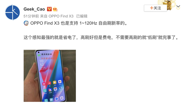 自发布以来,OPPO Find X3系列的热度一直都是只增不减,无论是辨识度极高的外观还是屏幕、影像等方面,都是网友们热议的话题。就在近日,有大V爆料了OPPO Find X3系列的新消息,表示OPPO Find X3系列已经完成了1-120Hz调试,屏幕刷新率可以在1Hz到120Hz之间动态调整。此消息一出也让大家感到很惊喜,纷纷感叹高刷新率和低功耗终于可以很好地兼顾了。