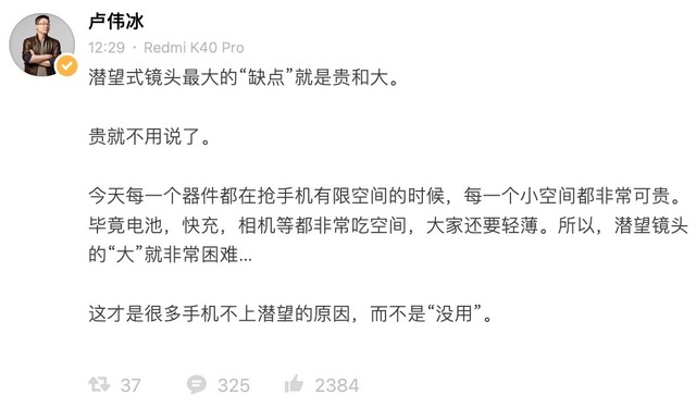 近日,卢伟冰发布微博称,潜望式镜头最大的“缺点”就是贵和大。贵就不用说了,今天每一个器件都在抢手机有限空间的时候,每一个小空间都非常可贵。毕竟电池,快充,相机等都非常吃空间,大家还要轻薄。所以,潜望镜头的“大”就非常困难…