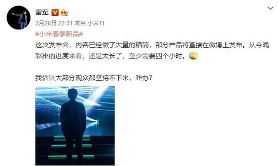 一口气推出的新品太多,对于用户来说是件好事,毕竟会有更多选择。但是,这对小米集团主持发布会的人来说就是“煎熬”了。近日,小米集团创始人、董事长兼CEO雷军在微博上表示,这次发布会内容已经做了大量的精简,部分产品将直接在微博上发布。从彩排的进度来看,时间还是太长,至少需要四个小时。在3月26日,小米集团副总裁、Redmi品牌总经理卢伟冰就在微博上称,新品太多,发布会当天需要准备纸尿裤。