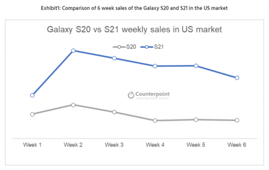 此前公布的数据显示,三星Galaxy S21系列在美国的首月销量是去年S20系列的三倍。而最新的统计数据显示,在发布的前六周内,其S21系列产品的销售量比S20系列产品高出一倍。
