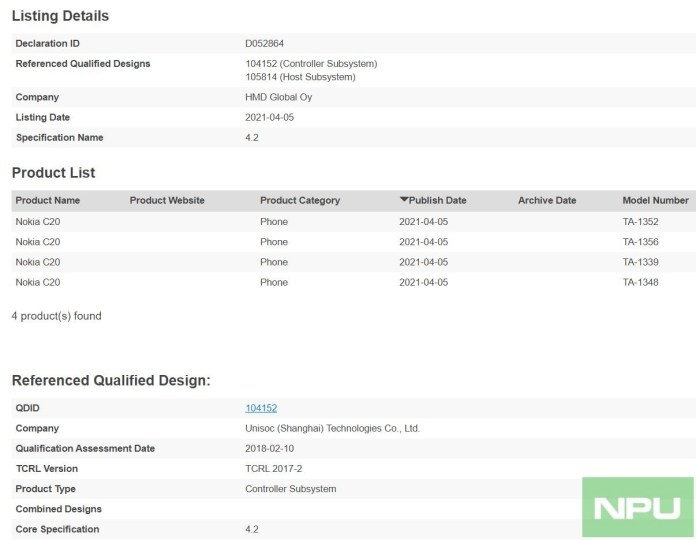 而诺基亚 C20 现在以 TA-1339,TA-1348,TA-1352,TA-1356 型号获得蓝牙认证,并正式确认诺基亚 C20 命名。认证信息显示它将搭载 紫光展锐芯片。