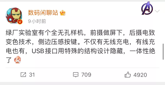 OPPO 最近也被爆料,称已经在实验室中做出了全无孔样机,并且用特殊的结构设计保留了有线充电接口。