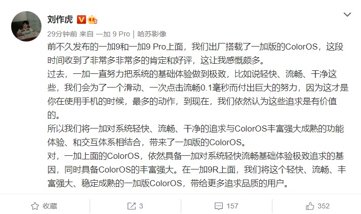 刘作虎表示,前不久发布的一加 9 和一加 9 Pro 上面,出厂搭载了一加版的 ColorOS,这段时间收到了非常多非常多的肯定和好评,这让我感慨颇多。我们将一加对系统轻快、流畅、干净的追求与 ColorOS 丰富强大成熟的功能体验、和交互体系相结合,带来了一加版的 ColorOS。